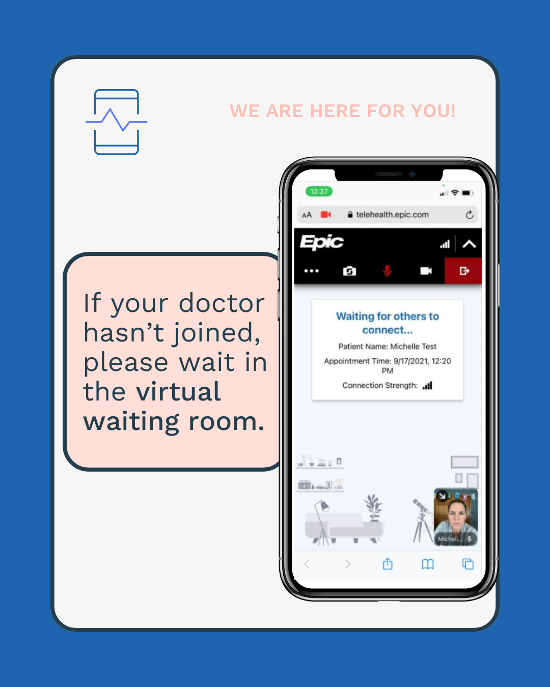 It’s easy! You will receive a link via text message when your doctor is ready. Click the link, follow the prompts, and wait for your doctor to join.