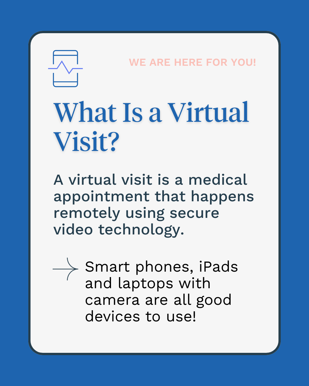 When scheduling your visit, the provider will determine if a video visit is right for you.