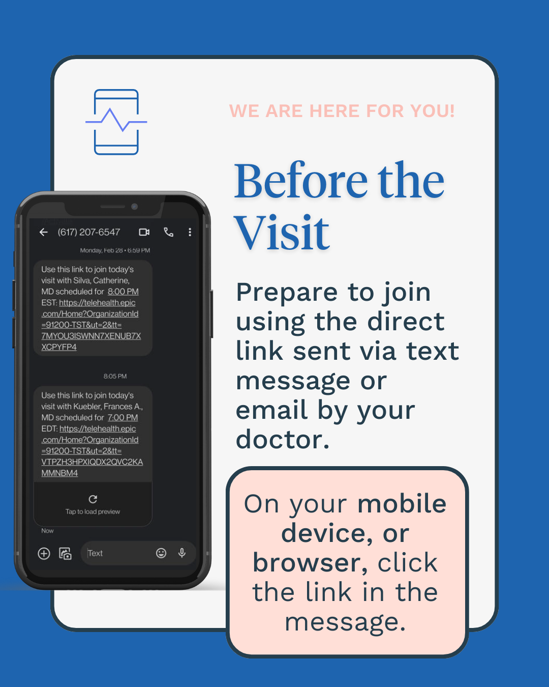 It’s easy! You will receive a link via text message when your doctor is ready. Click the link, follow the prompts, and wait for your doctor to join.